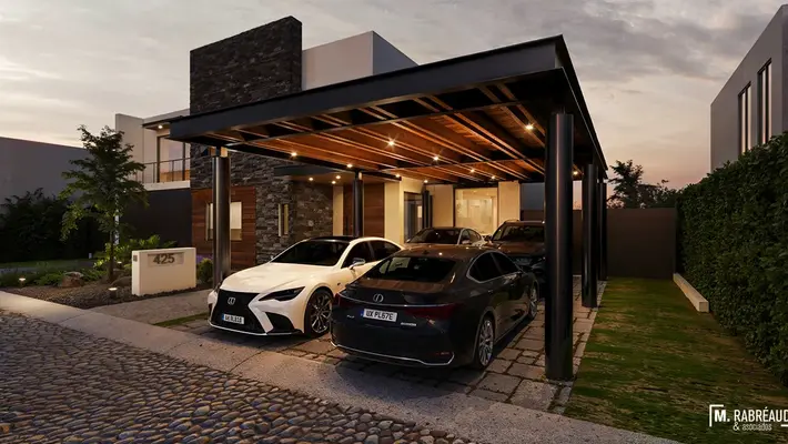 Asimismo, se remodela el jardín posterior incorporando un diseño paisajístico con iluminación ambiental, adaptado a las necesidades de la familia. Se amplía también la cubierta para los automóviles, construida con estructura de madera rústica y acero en color negro, representado en columnas tubulares y vigas IPR, respetando y armonizando con el diseño original de la vivienda. Todo ello contribuye a resaltar y enriquecer la imagen de lujo y amplitud en la fachada principal.